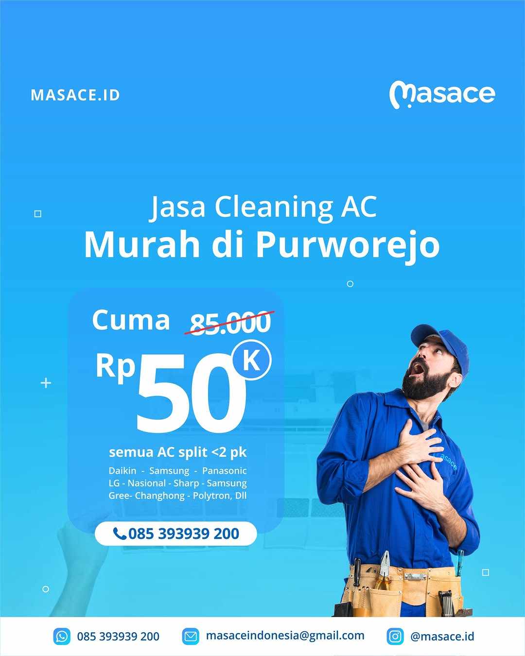 Dengan dukungan teknisi yang berpengalaman, alat kerja modern, serta pelayanan yang ramah dan cepat, Massace Indonesia berkomitmen memberikan kenyamanan dan kualitas udara sejuk terbaik untuk pelanggan.